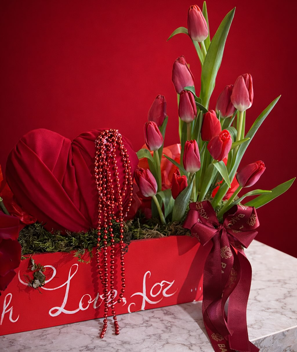 Dərin qırmızı güllər və bənövşəyi xallı orkidelərdən ibarət lüks kompozisiya. Açıq pembe silindrik qutuda Kraliça və Kral ürək kartları motivləri, qırmızı lentlər, Royal Roses möhürü; dekorativ ox və hədəf ilə romantik təqdimat. 14 Fevral və sevgi hədiyyəsi üçün.